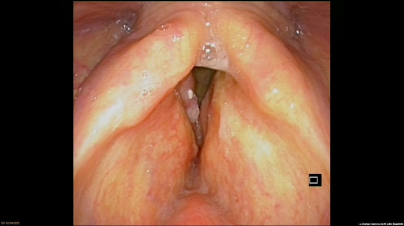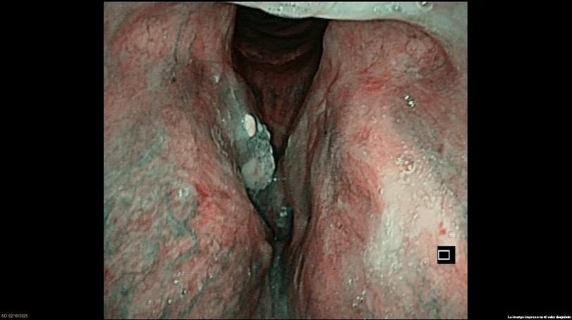 Exophytic lesion on the right vocal cord. NBI suspicious for malignancy. Laryngeal dysplasia. Ventricle and AC appear clear. Motility preserved